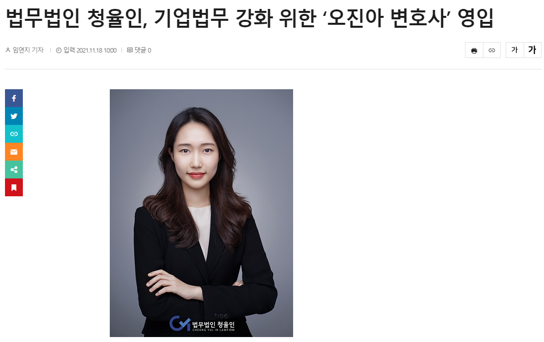 | Á¦¸ñ | ¹ý¹«¹ýÀΠûÀ²ÀÎ, ±â¾÷¹ý¹« °È À§ÇÑ ¡®¿ÀÁø¾Æ º¯È£»ç¡¯ ¿µÀÔ |