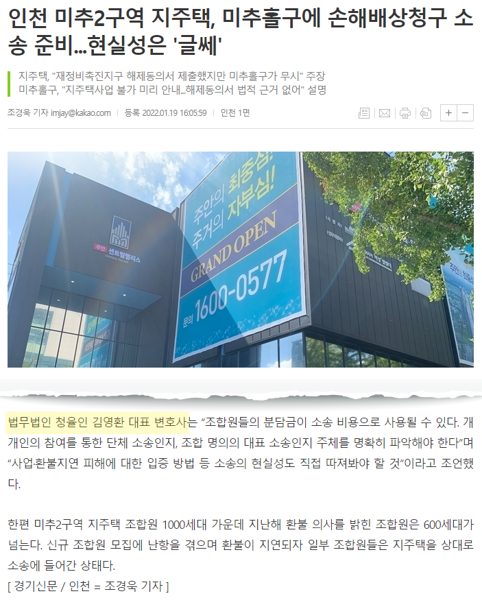 ![]() 19ÀÏ ºÎµ¿»ê¾÷°è¿¡ µû¸£¸é ÁÖ¾È ¼¾Æ®·²ÆÓ¸®½º»ç¾÷À» ÃßÁø ÁßÀÎ ¡®(°¡Äª)¹ÌÃß2±¸¿ª Áö¿ªÁÖÅÃÁ¶ÇÕ¡¯Àº ÃÖ±Ù Á¶ÇÕ¿øµé¿¡°Ô ¡®¹ÌÃßȦ±¸¿¡ ´ëÇÑ ¼ÕÇØ¹è»óû±¸ ¼Ò¼Û Âü°¡ÀÇÇ⼡¯¸¦ ¹ß¼ÛÇß´Ù. À̵éÀº ¡°Á¶ÇÕ¿ø¸ðÁý Çã°¡ µî Àû¹ýÇÑ ÇàÁ¤ÀýÂ÷¸¦ °ÅÃÄ »ç¾÷À» ¿î¿µ ÁßÀε¥, ¹ÌÃßȦ±¸´Â ¹ÌÃß2±¸¿ªÀ» Æ÷ÇÔÇÑ ÀçÁ¤ºñÃËÁøÁö±¸¿¡¼ ÁöÁÖÅûç¾÷ÀÌ ºÒ°¡ÇÏ´Ù°í ¼³¸íÇØ ÀڽŵéÀÌ °áÁ¤ÇÑ ÇàÁ¤Á¶Â÷ Ã¥ÀÓÁöÁö ¾Ê°í ÀÖ´Ù¡±°í ÁÖÀåÇß´Ù. ¶Ç ¡°¹ÌÃß2±¸¿ª ÅäÁö¼ÒÀ¯ÁÖ 30% ÀÌ»óÀÌ ÀçÁ¤ºñÃËÁøÁö±¸ ÇØÁ¦µ¿ÀǼ¸¦ Á¦ÃâÇßÁö¸¸ À̸¦ ´Ü¼ø ÀϺΠ¼ÒÀ¯ÀÚ ÀǰßÀ¸·Î Ä¡ºÎÇØ ÇØÁ¦¸¦ ¹Þ¾ÆµéÀÏ ¼ö ¾ø´Ù°í Çß´Ù¡±¸ç ¡°»ç¾÷Áö¿¬¿¡ µû¸¥ ºÒ¾È°¨ ¹× ÃßÈÄ ºÐ´ã±Ý Áõ°¡ µî¿¡ ´ëÇÑ ¿ì·Á, ÀÚ±Ý ºÎÁ·À¸·Î ÀÎÇÑ È¯ºÒ Áö¿¬À¸·Î °æÁ¦Àû ÇÇÇØ´Â ¹°·Ð Á¤½ÅÀû °íÅëÀ» ÀÔ´Â »óȲ¡±À̶ó°í ¼Ò¼Û »çÀ¯¸¦ ¹àÇû´Ù. ÇÏÁö¸¸ ÁöÁÖÅÃÀÇ ÀÌ °°Àº ÁÖÀåÀº Çö½Ç¼ºÀÌ ¶³¾îÁø´Ù´Â ÁöÀûÀÌ´Ù. ¹ÌÃßȦ±¸´Â Áö³ 2020³â 3¿ù ÁöÁÖÅÿ¡ Á¶ÇÕ¿ø¸ðÁý Çã°¡¸¦ ³»ÁÖ¸é¼ ¡®¹ÌÃß2±¸¿ªÀÌ ÀçÁ¤ºñÃËÁøÁö±¸¿¡¼ Á¦Ã´µÇ±â Àü±îÁö ÁöÁÖÅûç¾÷ ÃßÁøÀº ºÒ°¡´ÉÇÏ´Ù. ÀÎõ½Ã µµ½ÃÀçÁ¤ºñÀ§¿øÈ¸ ½ÉÀÇ °áÁ¤ ÈÄ »ç¾÷À» ÃßÁøÇØ ´Þ¶ó¡¯°í ¾È³»ÇÑ ¹Ù ÀÖ´Ù. ¾î¿ ¼ö ¾øÀÌ Á¶ÇÕ¿ø¸ðÁýÀ» Çã°¡ÇßÁö¸¸ ÁÖ¾È2¡¤4µ¿ ÀçÁ¤ºñÃËÁøÁö±¸¿¡ ¹ÌÃß2±¸¿ªÀÌ ±×´ë·Î ³²À» °¡´É¼ºÀÌ ÀÖÀ¸´Ï È®½ÇÇÑ °áÁ¤ ÈÄ »ç¾÷À» Ç϶ó´Â ¾ê±â´Ù. ½ÇÁ¦ Áö³ 2018³â Á¤ºñ±¸¿ª(Àç°³¹ß)ÀÌ ÇØÁ¦µÈ ¹ÌÃß2±¸¿ªÀº 2020³â ÀçÁ¤ºñÃËÁøÁö±¸¿¡¼ ºüÁ®³ª°¡´Â ´ë½Å À¯Áö(Á¸Ä¡)¸¦ °áÁ¤Çß°í, ¿ÃÇØ »ó¹Ý±â ÀÎõ½ÃÀÇ ÃÖÁ¾ °áÁ¤À» ¾ÕµÎ°í ÀÖ´Ù. ±¸ °ü°èÀÚ´Â ¡°Á¤ºñ±¸¿ª ÇØÁ¦¿Í ´Þ¸® ÀçÁ¤ºñÃËÁøÁö±¸ Á¦Ã´ ¿©ºÎ´Â ÅäÁö¼ÒÀ¯ÁÖÀÇ 30% µ¿ÀǼ·Î °áÁ¤µÇ´Â °Ô ¾Æ´Ï´Ù¡±¶ó¸ç ¡°Á¦ÃâµÈ µ¿ÀǼ´Â ¹ýÀû ±Ù°Å°¡ ¾ø¾î ÁøÀ§ ¿©ºÎ¸¦ È®ÀÎÇÏÁö ¾Ê¾Ò´Ù. ¼Ò¼Û¿¡ ´ëÇÑ ´ëÀÀ ¹æ¾ÈÀ» ÁغñÇϰڴ١±°í ¸»Çß´Ù. ¹ý¹«¹ýÀΠûÀ²ÀÎ ±è¿µÈ¯ ´ëÇ¥ º¯È£»ç´Â ¡°Á¶ÇÕ¿øµéÀÇ ºÐ´ã±ÝÀÌ ¼Ò¼Û ºñ¿ëÀ¸·Î »ç¿ëµÉ ¼ö ÀÖ´Ù. °³°³ÀÎÀÇ Âü¿©¸¦ ÅëÇÑ ´Üü ¼Ò¼ÛÀÎÁö, Á¶ÇÕ ¸íÀÇÀÇ ´ëÇ¥ ¼Ò¼ÛÀÎÁö ÁÖü¸¦ ¸íÈ®È÷ ÆÄ¾ÇÇØ¾ß ÇÑ´Ù¡±¸ç ¡°»ç¾÷¡¤È¯ºÒÁö¿¬ ÇÇÇØ¿¡ ´ëÇÑ ÀÔÁõ ¹æ¹ý µî ¼Ò¼ÛÀÇ Çö½Ç¼ºµµ Á÷Á¢ µûÁ®ºÁ¾ß ÇÒ °Í¡±À̶ó°í Á¶¾ðÇß´Ù. ÇÑÆí ¹ÌÃß2±¸¿ª ÁöÁÖÅà Á¶ÇÕ¿ø 1000¼¼´ë °¡¿îµ¥ Áö³ÇØ È¯ºÒ Àǻ縦 ¹àÈù Á¶ÇÕ¿øÀº 600¼¼´ë°¡ ³Ñ´Â´Ù. ½Å±Ô Á¶ÇÕ¿ø ¸ðÁý¿¡ ³Ç×À» °ÞÀ¸¸ç ȯºÒÀÌ Áö¿¬µÇÀÚ ÀϺΠÁ¶ÇÕ¿øµéÀº ÁöÁÖÅÃÀ» »ó´ë·Î ¼Ò¼Û¿¡ µé¾î°£ »óÅ´Ù. [ °æ±â½Å¹® / ÀÎõ = Á¶°æ¿í ±âÀÚ ] ¸µÅ© https://www.kgnews.co.kr/news/article.html?no=686297 |